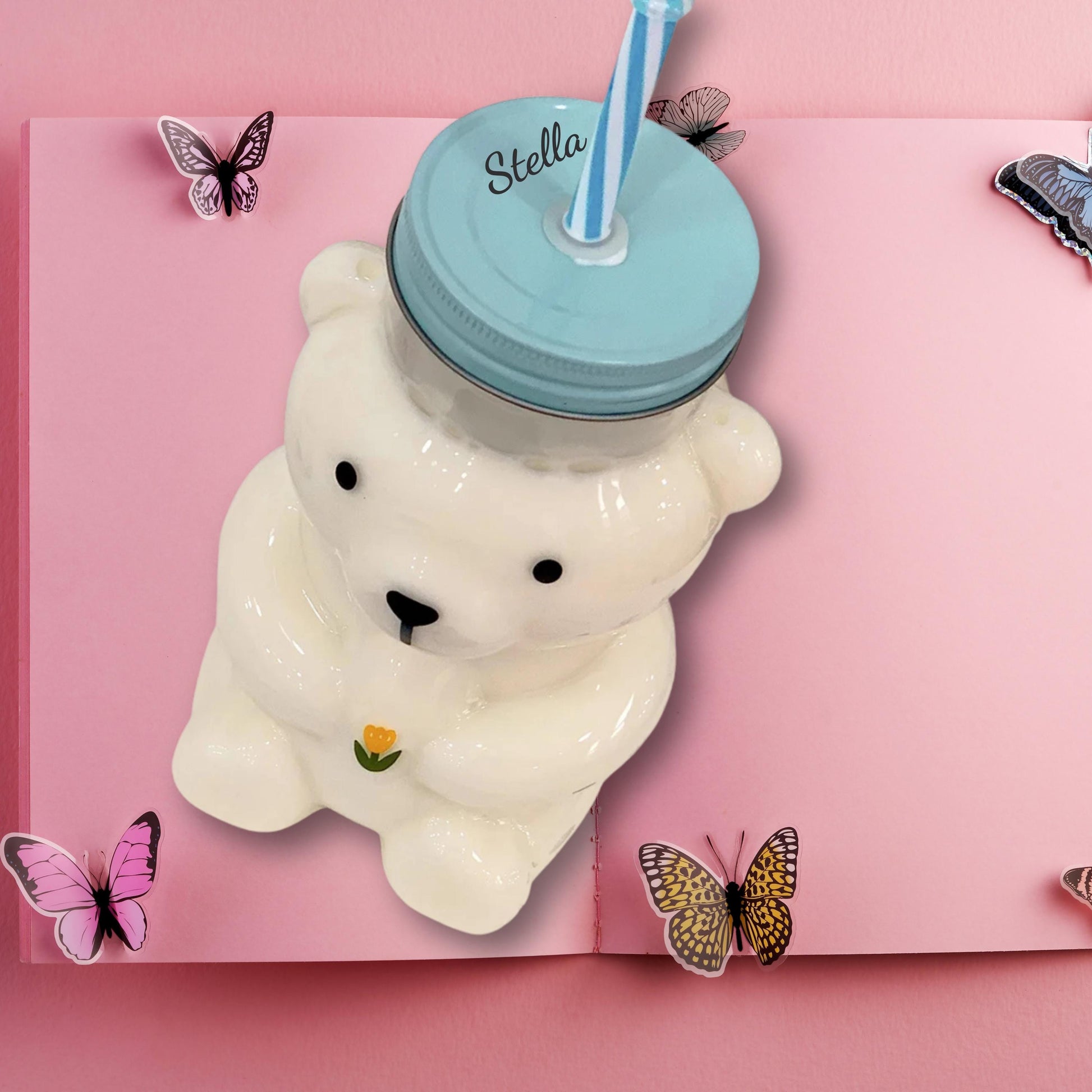 Bear Shaped Coffee Cup, Personalized Bear Glass Mug, Engraved Iced Coffee Cup with Straw, Cute Animal Coffee Mug, Custom Coffee Lovers Gift