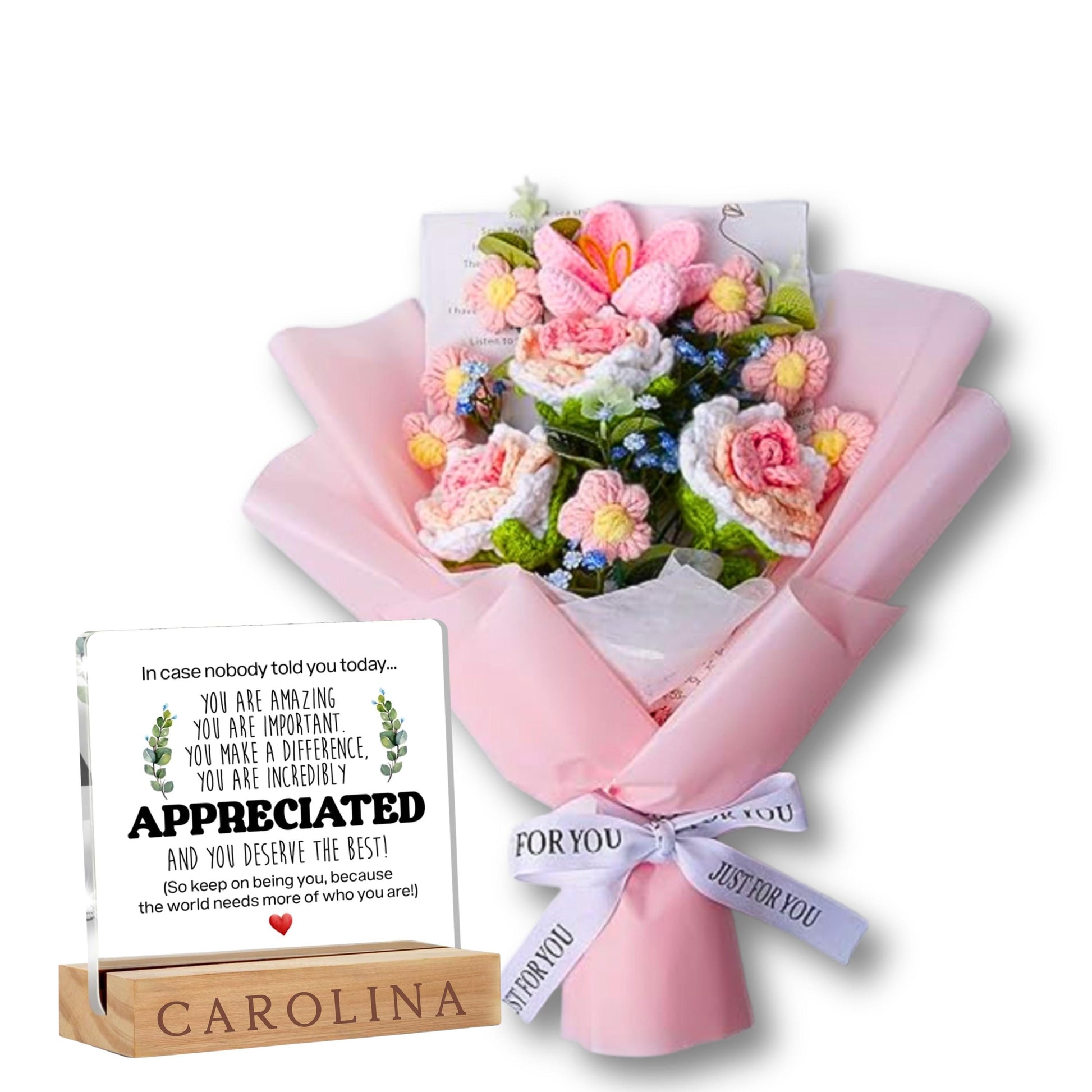Crochet Flower Bouquet with Personalized Engraved Desk Sign, Handmade Crochet Floral Gift with Custom Wooden Base, Appreciation Gift for Her