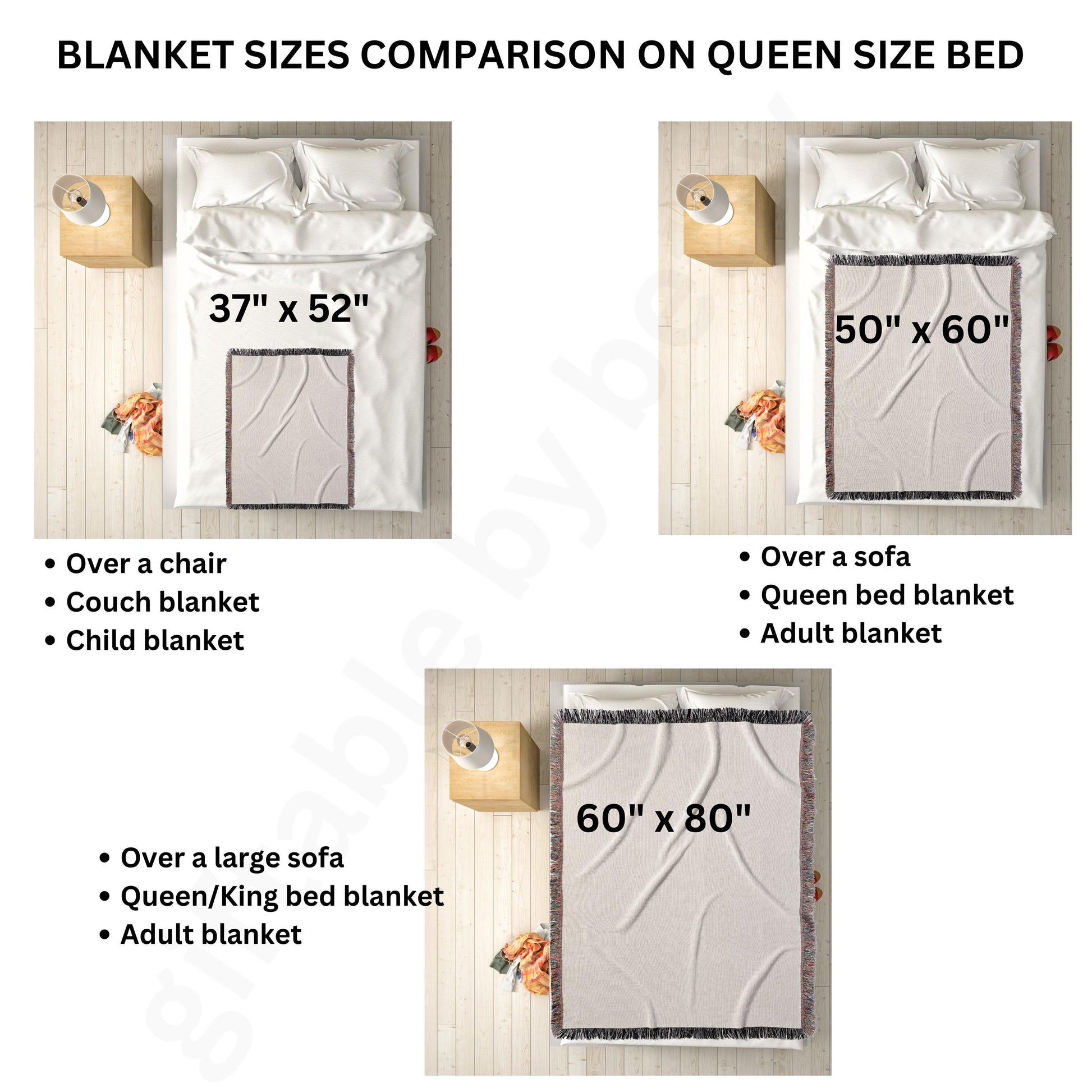 - Comes in three sizes: 37"x 52", 50"x60" and 60"x80"