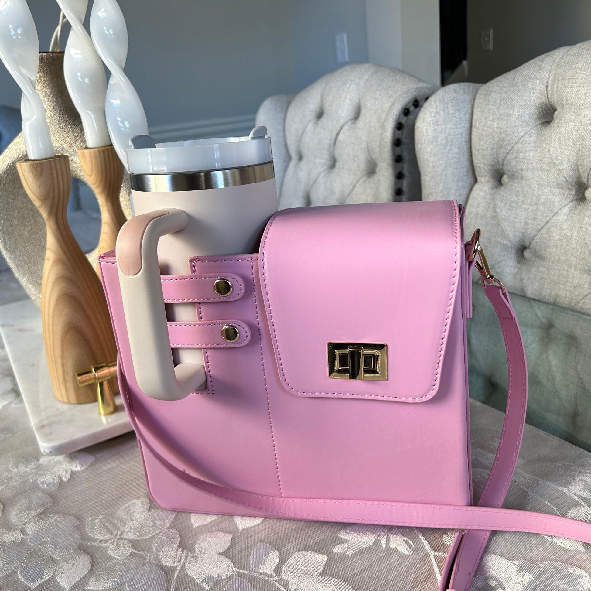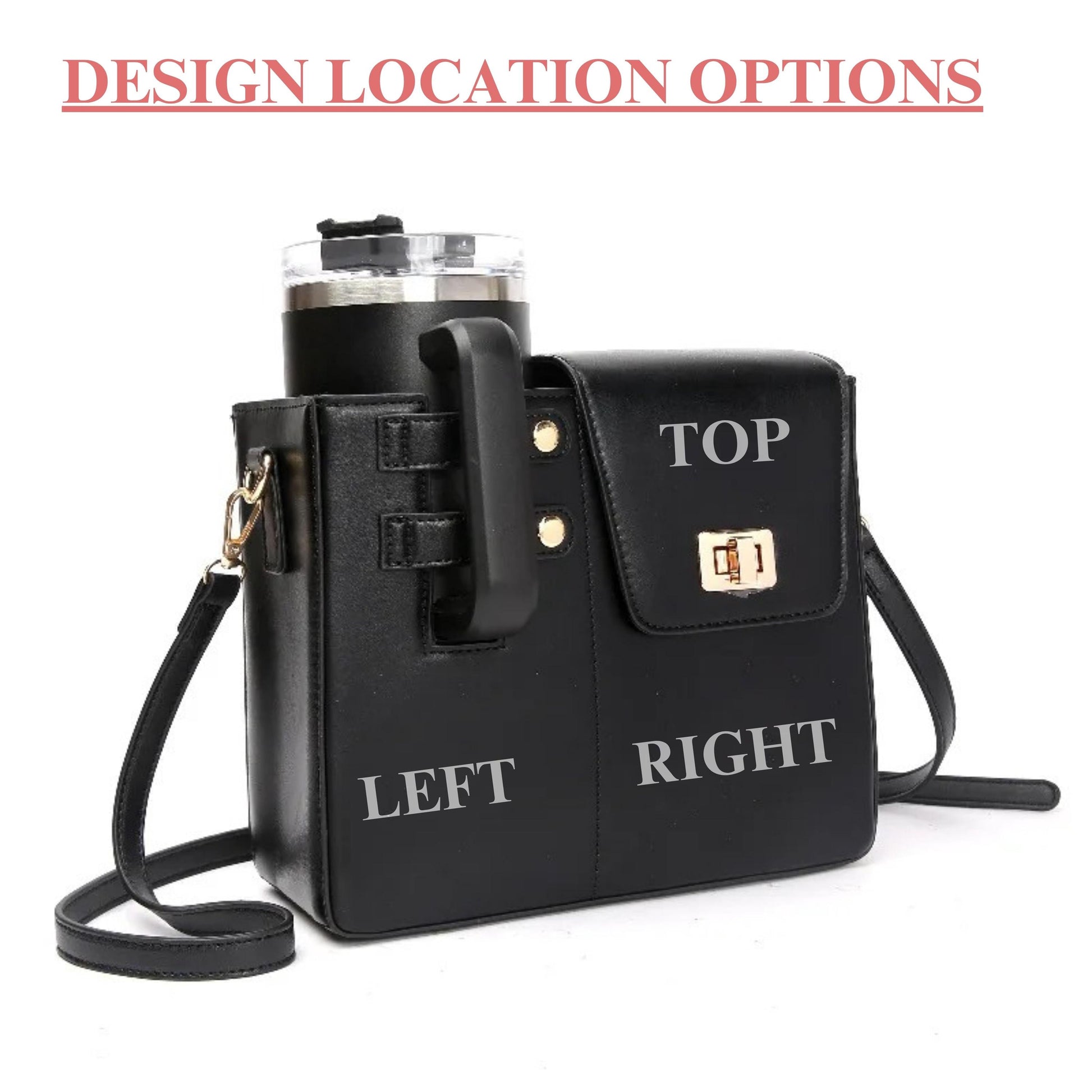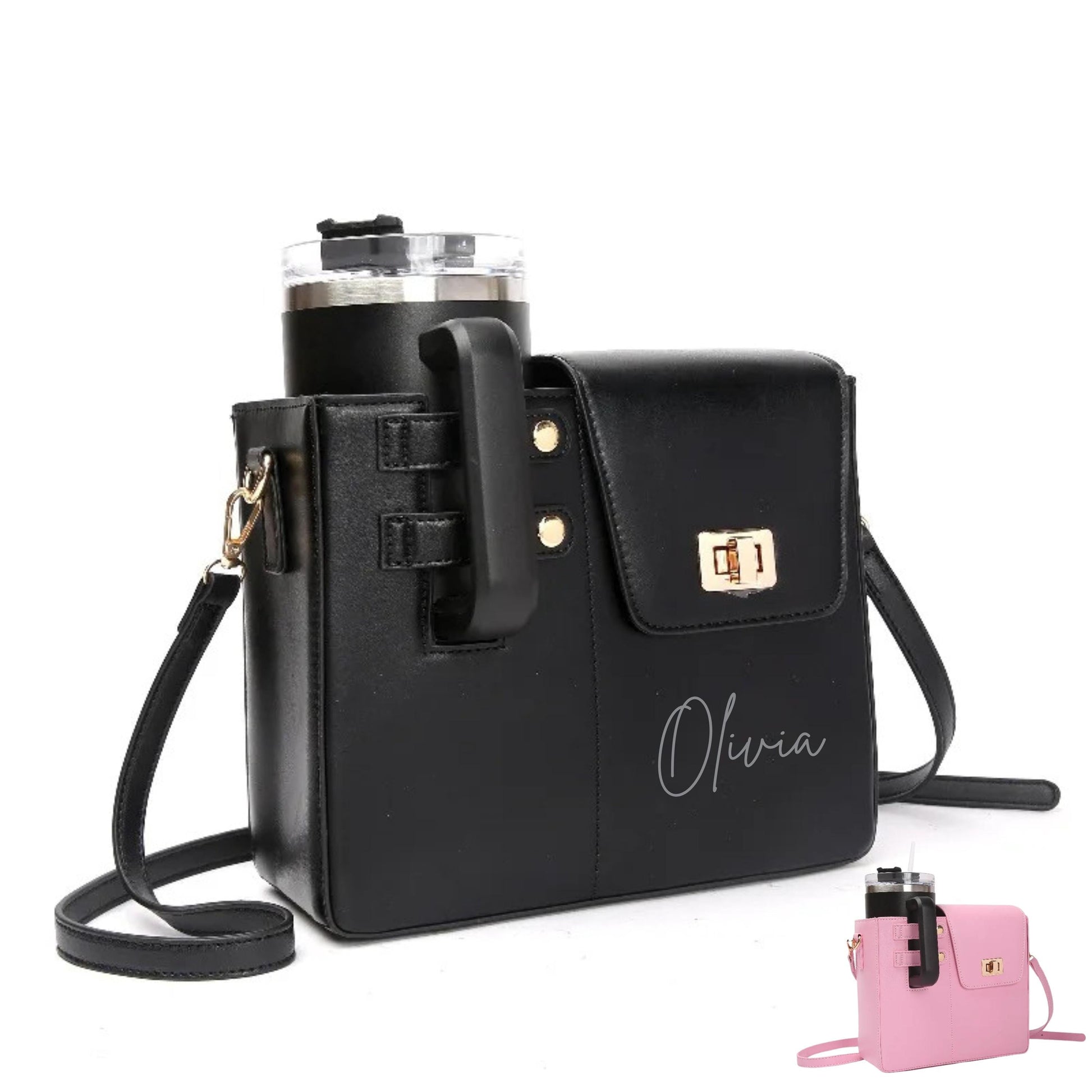 Therefore, elevate your hydration game with this stylish and practical personalized tumbler holder bag. The sleek black or pink pu leather-look design features a custom laser-engraved initial, adding a personal touch to your everyday carry. This versatile crossbody bag includes a specially designed holder that securely fits standard-sized tumblers or water bottles, keeping your drink upright and easily accessible. The bag‘s thoughtful design incorporates a sturdy twist lock closure, gold-tone hardware accents, and an adjustable shoulder strap for comfortable wear. A separate compartment provides space for essential items, making it perfect for outdoor events, shopping trips, or daily use. Also available in different colors, this functional accessory combines style with practicality, letting you carry your favorite beverage hands-free while maintaining a fashionable appearance.