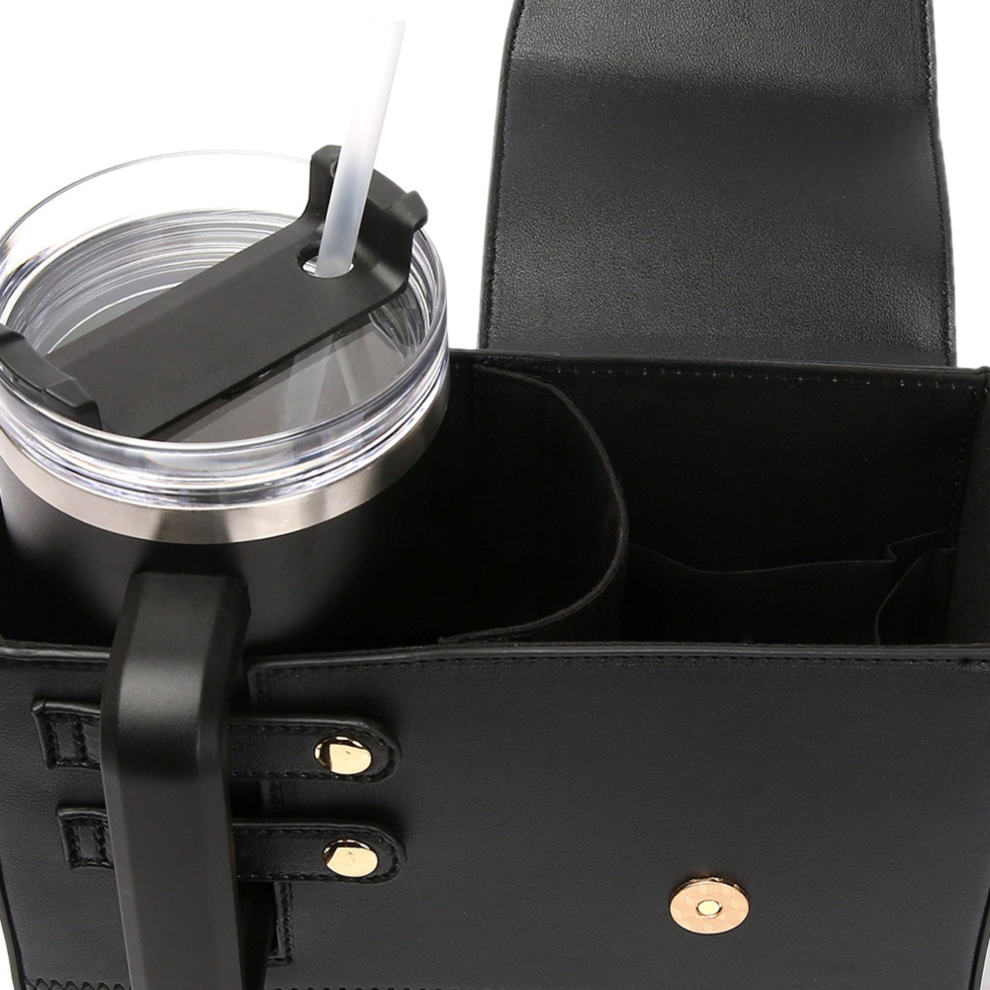 COMPATIBILITY: Built-in holder perfectly fits different standard tumblers from 8oz to 40 oz, keeping your drink secure and accessible