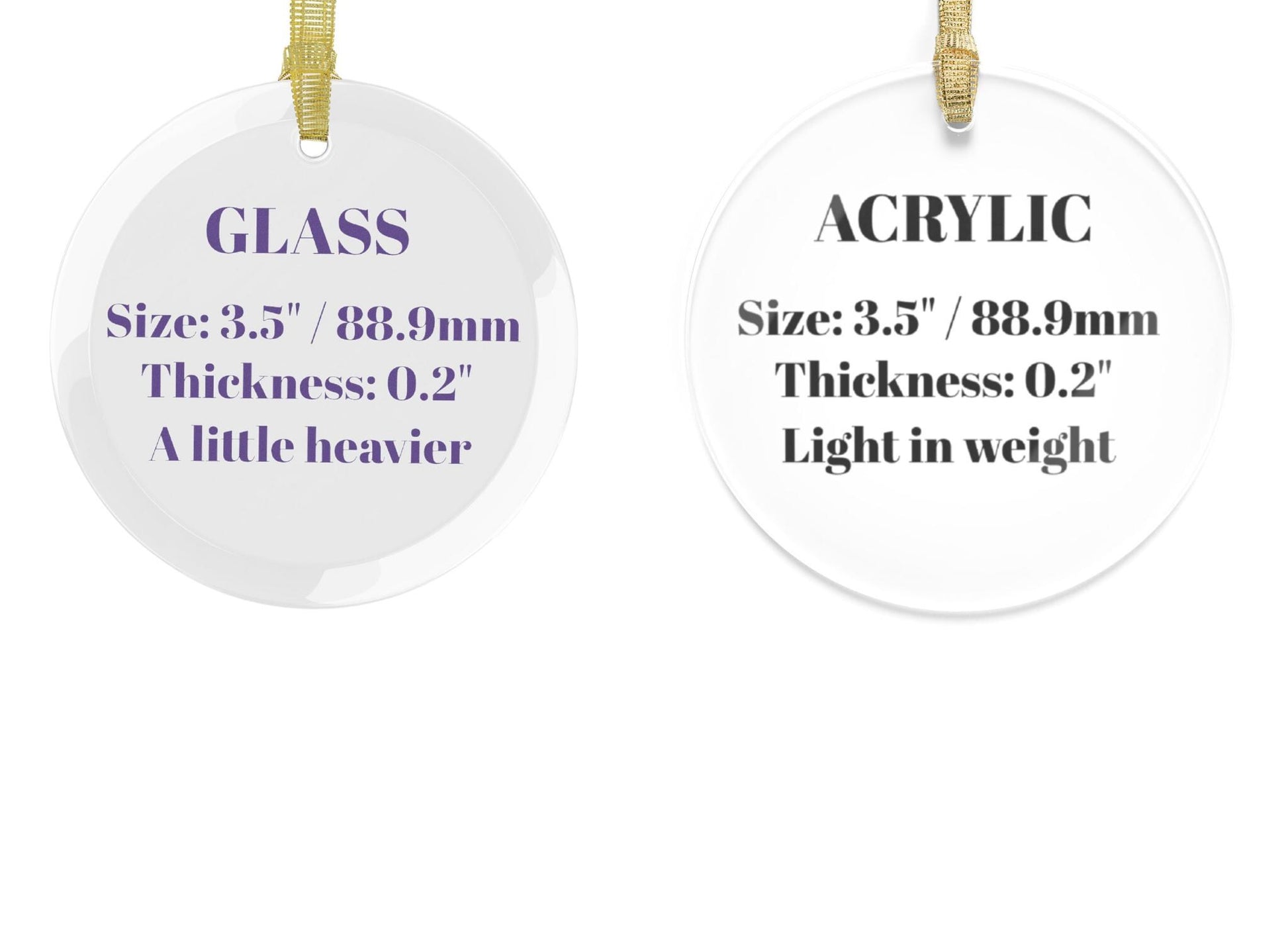 - 100% glass (a little heavier than the acrylic and metal ornament options)