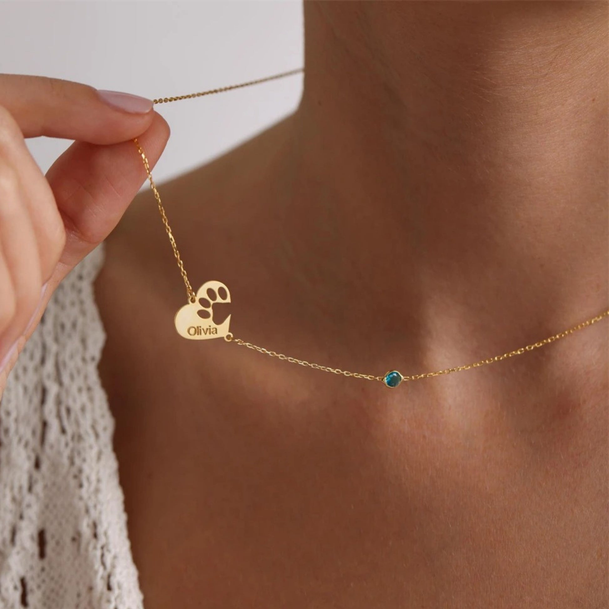 Personalized Paw Print Heart Necklace with Name & Birthstone – Custom Pet Lover Gift, Dog Cat Memorial Jewelry