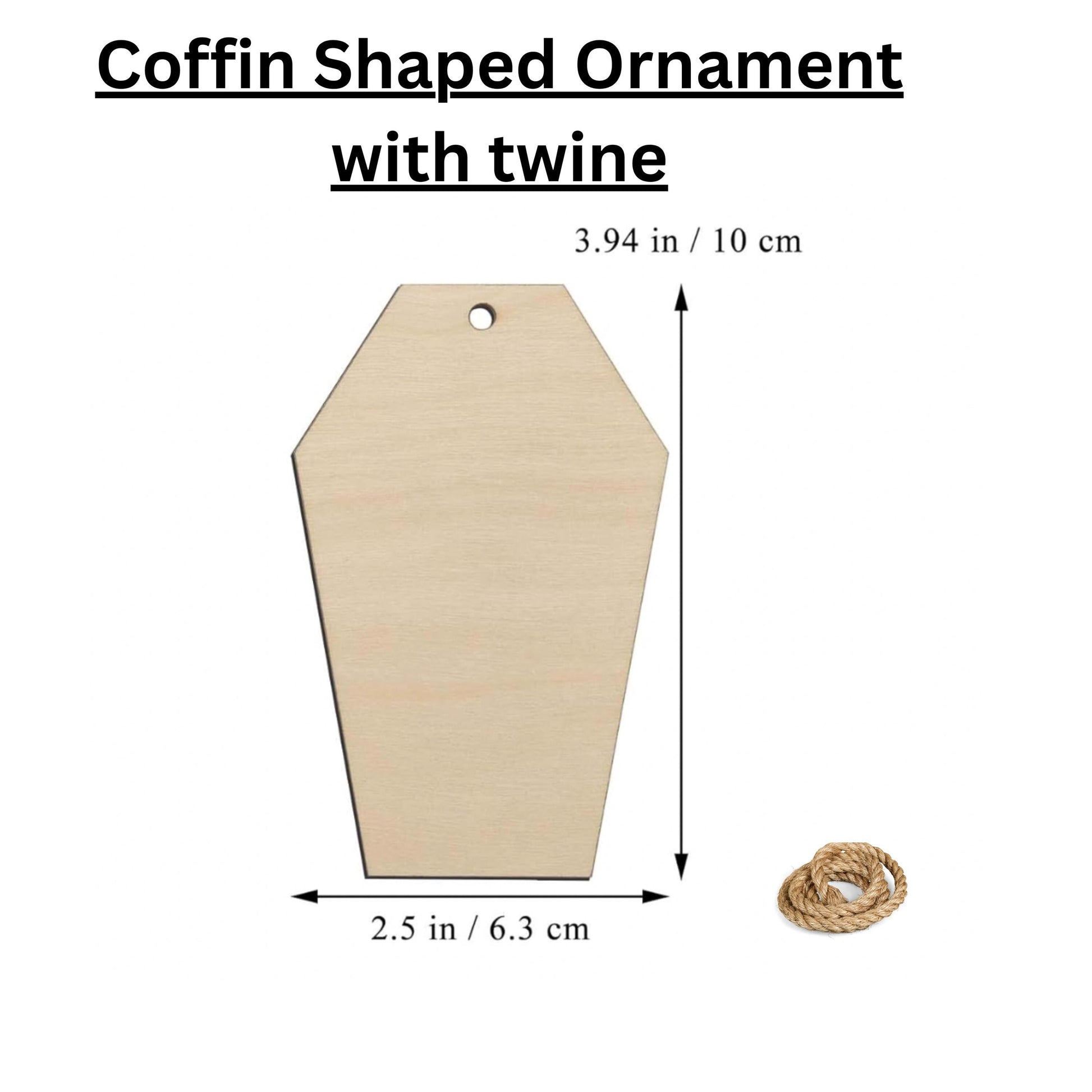 1 Wooden Stand or coffin shaped ornament with twine, custom engraved with your choice of text